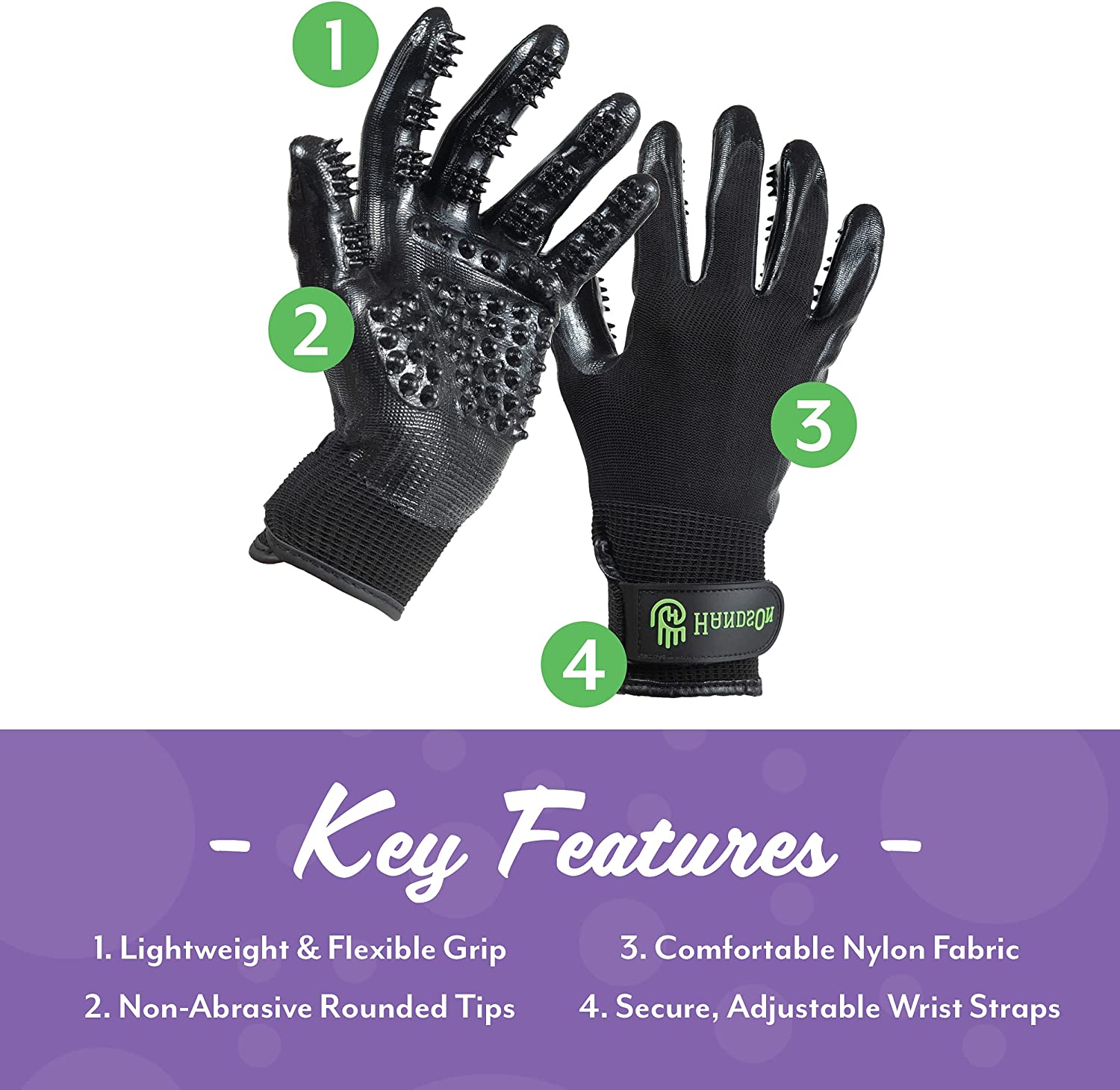 • [ The Original Patented Pet Grooming Glove ] : The rubber nodules found in our lightweight gloves are unique and considerately made to massage your pet gently like a brush with flexible bristles, with the durability to last through many baths, playful biting and lots of love! Our unique PVC and high-quality nitrile rubber structure combined with strong nylon fabric is easy to clean and bite-proof; made to withstand all types of pet personalities with each pair