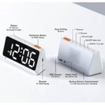 Keep life simple and wake up on time for the day.OCUBE LED night light clock features an extra-large 6″ display and provide you with the essential functions you need to rest,recover,and greet the day. The special thing that separates this clock from the rest is the 7-color night light with 0-100% adjustable brightness located on the bottom of the clock that make it an excellent addition to your desk or bedside table. 8-color illuminated digits are bright and easy to read in the dark.If you find them too bright when you are trying to fall asleep there is a dimmer switch to lower the intensity of the illumination. Prefer to ease into the day? Program a snooze option from 1 to 15 minutes.Snooze button is conveniently located on the top so they are easily located in the dark.Don’t forget to plug your device into its USB charger. Rest easy with the large RGB LED bedside clock with optional battery backup in case you should lose power,this clock will still awake you to your set alarm.Display will need to be reset when power is restored.