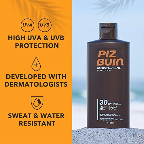 Piz Buin SPF 30 high protection in sun moisturising sun lotion with advanced UVA/UVB filters helps to protect the skin from the sun. Enriched with a strong anti-oxidant to help prevent sun induced premature skin ageing. The non greasy, non sticky formula intensely moisturises your skin, leaving it smooth and silky soft.