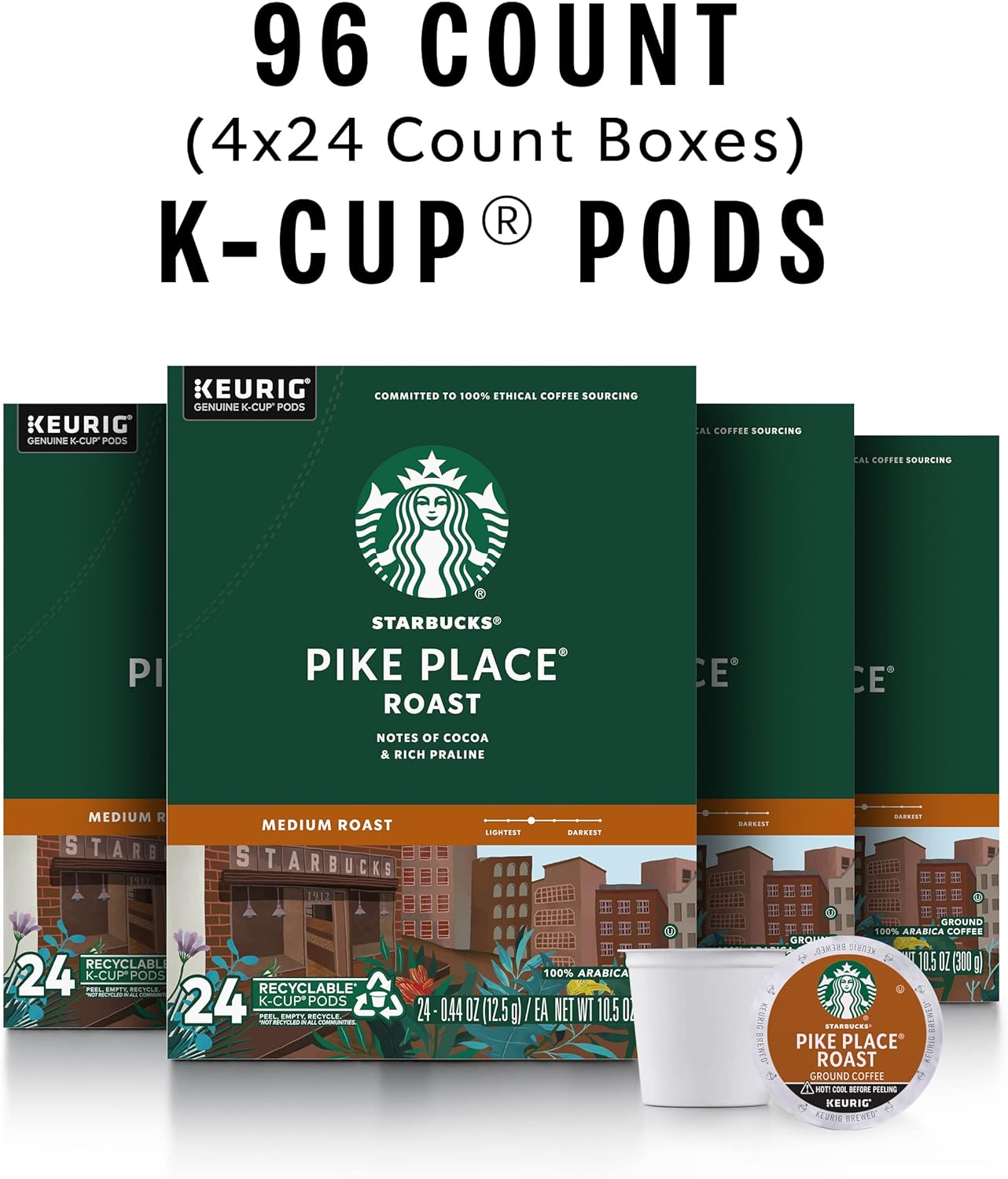 PREMIUM COFFEE IN KEURIG K-CUPS—Starbucks delivers exceptional coffee cup after cup with Pike Place Roast medium roast coffee K-Cups—96 total coffee pods for Keurig coffee makers